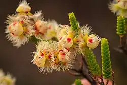 The flowers are arranged in short spike-like groups near the ends of the branches, each flower on a stalk about 1 mm (0.04 in) long. The floral cup is top-shaped, 2 mm (0.08 in) long, glabrous with small green appendages. The sepals are greenish-white to cream, sometimes pink, about 3 mm (0.1 in) long with 4 to 7 hairy lobes. The petals are the same colour as the sepals, erect, 4 mm (0.2 in) long with pointed lobes a further 1.5 mm (0.06 in) long. The style is 4 mm (0.2 in) long, bent and hairy near the tip. Flowering time is from September to November.[2]