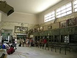 The passenger building has a ticket counter, ticket machines, a police station, a bar, and a kiosk. In the square in front of the building is a bus stop for buses and taxis. The lobby contains numerous black and white photographs of Viareggio's prominent locations. They were taken by Mario Cimoli, stationmaster and noted outdoor photographer, and member of the partisans in World War II.