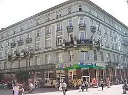 The square stretches from Halytska Street to Vitovsky Street. Vitovsky street connects the Viche Maidan with another city square - the Mickiewicz Square. Viche Maidan is a crossroad of many streets - Bachynsky Street, Belvederska Street, and the Nezalezhnist street. The first part of Nezalezhnist street is called stometrivka (Ukrainian: Стометрівка), which means "100-hundred-meters-street".[1] It is surrounded by numerous buildings such as the main post office, the Ukrtelecom building, the Passage of Gartenbergs, the business center "Kyiv", and many others. The square has couple of fountains, flowerbeds, and a small park.