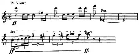 The work is scored for a symphonic orchestra of three flutes (including (piccolo), two oboes (including Cor Anglais), two clarinets, two bassoons, contrabassoon, four horns, three trumpets, three trombones, tuba, harp, three timpani and more percussion, solo-violin, strings (divisi in I).[3] The pieces can be played individually or as "a quasi-symphony".[4]