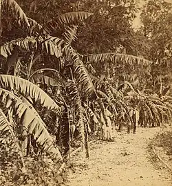 The grounds contained lemon, banana, olive, plum, pear, peach, and apricot, English walnut, Spanish chestnut, hickory and pecan-trees, 2,000 orange trees, date and cabbage palms, Chinese and Japanese cane, tea-plant, as well as camelias and roses.[5] Among the rare trees were camphor and cinnamon from Ceylon. Bamboos grown included the sacred tree of India and five varieties of cane. All the well-known varieties of the flowers of the temperate and the tropical zones also grew.[4]