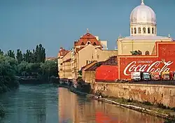 Oradea, 1998: a Coca-Cola advertisement along the Crișul Repede, in front of the Neolog Synagogue