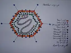 Adenovirus structure showing the double stranded DNA inside the virus coat of proteins. The vinnexin gene is coded by one part of this double stranded DNA. The vinnexin protein itself is only manufactured by and found in the host, not the virus itself.