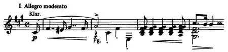 The first movement has two contrasting themes, the first in dotted rhythm and initially hesitant and the second in B major (begun by the cellos), wide-ranging and expressive. These are, in turn, dissected and ornamented by the soloist with formidable virtuosity, using multiple-stopping and harmonics and, notably in the cadenza, the extreme upper register of the violin.[2]