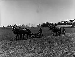 Many of the early settlers to the Virginia district came from the British Isles and amongst them the Irish escaping the Great Famine. Virginia became well known as an Irish settlement. Early settlers worked long and hard hours to clear thick bushland in the area. Initially wheat was one of the major crops planted at Virginia until Adelaide required large amounts of hay to feed the increasing number of horses being used for transportation. Before the railway line to Virginia was opened in 1916 people would travel through on the Cobb and Co Stage Coach as Virginia was a staging point. The journey to Adelaide would take all day.[2]