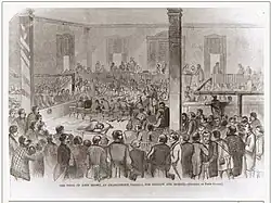 A second artist from Frank Leslie's Illustrated Newspaper was also in attendance,[17] and Harper's Weekly employed a local artist and nephew of Prosecuting Attorney Andrew Hunter, Porte Crayon (David Hunter Strother);[18][19] one of his drawings is in the Gallery, below. Leslie informed his readers that "one of our imitators" was publishing bogus pictures. He described how his paper had engravers and artists standing by in a New York hotel, and once a sketch had arrived from Charles Town, 16 artists worked simultaneously at transforming it (split into 16 segments) into an illustration ready to be printed.[20] The illustrations were so widely distributed that Yale Literary Magazine made fun of them, publishing the drawings of "our own artist on the spot" of "Governor Wise's shoes", "John Brown's watch", and the like.[21]