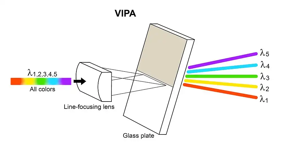 A virtually imaged phased array (VIPA)[1] is an angular dispersive device that, like a prism or a diffraction grating, splits light into its spectral components. The device works almost independently of polarization. In contrast to prisms or regular diffraction gratings, the VIPA has a much higher angular dispersion but has a smaller free spectral range. This aspect is similar to that of an Echelle grating, since it also uses high diffraction orders. To overcome this disadvantage, the VIPA can be combined with a diffraction grating. The VIPA is a compact spectral disperser with high wavelength resolving power.