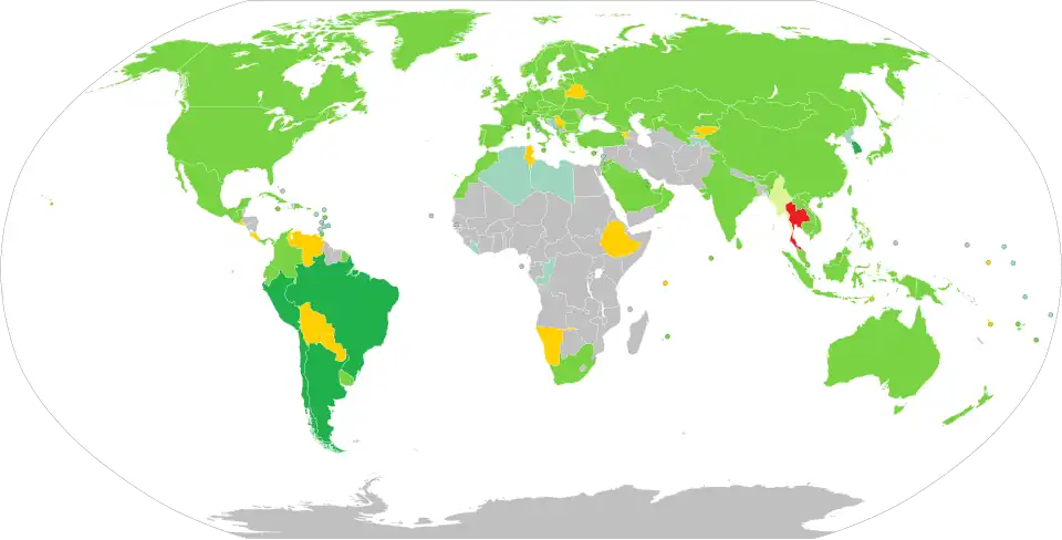 Citizens of the following countries or citizens arriving from the following countries require an International Certificate of Vaccination in order to enter Thailand, unless they produce evidence that they do not reside in the following areas.[22][23]