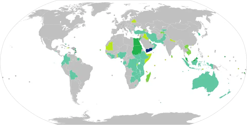 Countries and territories with visa-free entries or visas on arrival for holders of regular Yemeni passports.
