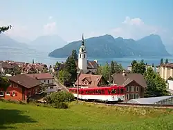 The Vitznau–Rigi railway line is a Swiss standard gauge rack railway that runs from Vitznau on the shore of Lake Lucerne to Rigi. It was built in 1871 by the Rigibahn, and is now owned by Rigi Railways, along with the Arth–Rigi railway line, which runs on the other side of the mountain, and the Weggis–Rigi Kaltbad cable car (Luftseilbahn Weggis–Rigi Kaltbad, LWRK).