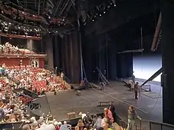 Beneath the stage is a turntable measuring 46 ft (14 m) across, which allows the thrust stage to be expanded.[8][16][27] When the thrust stage was used, the first seven rows of the orchestra could be lowered into the basement.[8][27] The turntable carries a semicircular floor panel with rows of orchestra seating (for when the theater is configured as a proscenium stage), as well as another semicircular panel with the thrust stage and three rows of seating. Whenever the stage is reconfigured, the lifts beneath the front orchestra rows and the thrust stage are lowered. The semicircular floor panels are then unlocked from the lift and connected to each other before being rotated, disconnected, and raised.[16] A second platform, measuring 5 ft (1.5 m) wide,[16] surrounds the turntable and can move independently.[8][16]