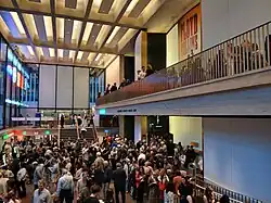 The Beaumont opened to the public on October 12, 1965, with previews of Danton's Death.[28] The Beaumont was dedicated on October 14[100] and hosted a fundraising gala on October 20, which raised more than $100,000.[101] The theater officially opened on October 21,[102][e] when regular performances of Danton's Death began.[104][105] The Beaumont's opening was not as widely reported in the media as some of Lincoln Center's other buildings, but it did receive mostly positive commentary.[7] Progressive Architecture wrote that the theater was "one of the most innovational theater facilities in this country".[6] John Chapman of the New York Daily News called the Beaumont's opening "the most important theatrical event of the 1965–66 season in this city", despite the mediocrity of Danton's Death.[106] Wolf Von Eckardt wrote for The Washington Post that the Beaumont had a "classic" architectural appearance "without sweat or striving".[107] The New York Concrete Board gave the Beaumont an award for the quality of its construction.[108]