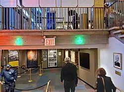 The library–theater building was the third to open at Lincoln Center.[13] Original plans conceived the library and theater as separate buildings, but the structures were combined in the final plan.[4][14] The theater forms the building's core and occupies the southern and western sides of the building's first and second floors.[4][15][16] The library runs along the building's northern and eastern sides, as well as much of the third floor. The theater's stage house protrudes through the third floor, with the library running around it in a "doughnut" shape. Another entrance to the library, facing west toward Amsterdam Avenue, is below the theater.[15][16] The attic houses the library's stacks.[15][17]