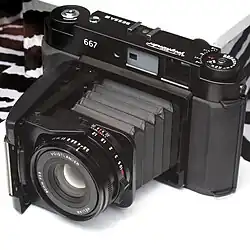 After the Voigtländer name was licensed to Cosina, the Bessa III aka Bessa 667 was released in 2008, which offered dual-format (6×7 and 6×6) images in a folding body with a coupled rangefinder that adjusts for parallax. A rebadged version was sold by Fujifilm as the GF670.[21] Later, a wide-angle version was sold, omitting the folding ability, as the 667W, with a 55 mm f/4.5 Color-Skopar lens.[22] The Bessa III line was discontinued in 2014.