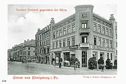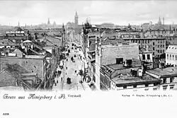 Vorstadt was divided into Vordere Vorstadt bordering the Pregel to the north and Hintere Vorstadt to the south bordering Haberberg. Vordere Vorstadt was originally documented as St. Antonsvorstadt, after St. Antonshospital, in 1376.[4] It was defended by a wall, palisades, and ditches in the year 1520 when it was threatened by Polish troops in the Horsemen's War.[5] In 1648 it was known as Innere Vorstadt and by 1677 as Vordere Vorstadt. It often suffered from fires; a conflagration in 1811 destroyed the house where Immanuel Kant was born.