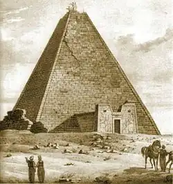 The place is so far little explored. The earliest known building on the site is a very large, two-story brick palace built by Queen Amanishakheto (first century AD) whose large pyramid in the royal cemetery at Meroe (BEG N 6) contained a hoard of gold jewellery found in the early 19th century by the Italian treasure hunter, Giuseppe Ferlini (NB: several references to this site erroneously identify the pyramid as having been built at Wad ben Naga).[2]