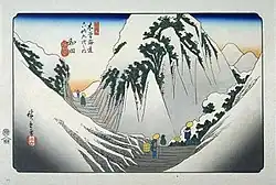 Hiroshige's ukiyo-e print of Wada-shuku dates from 1835–1838. The print depicts an exaggerated view of Wada Pass in wintertime, with Mount Ontake appearing in the upper right corner.