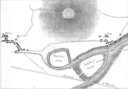 Wadbury camp lies on a ridge to the north of the steep valley of the Mells Stream, called the Wadbury Valley.[1] It is south of Newbury camp and west of Tedbury Camp, which is on the other side of the river.[2] Newbury Camp, on an elevated knoll 1 mile (1.6 km) north of Wadbury, would have been used as a look-out post over the surrounding countryside. Tedbury Camp, covering an area of 60 acres (24 ha), must have been an important stronghold. Wadbury Camp, on the opposite side of the Mells Stream, to the northwest of Tedbury, seems to have been an outpost of the larger camp.[3]
