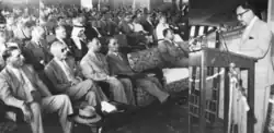 General Wajid, Muhammad Shoaib, Governor State Bank Abdul Qadir, Inspector General Police Fareed Khan, General Azam, listen to President Ayub Khan addressing guests at the foundation stone laying ceremony of the North Karachi Township (1959)