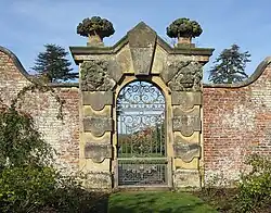 The Satyr Gate, completed in 1705, is built of limestone on the west front and brick elsewhere. It contains a round-arched gateway with a rusticated surround, carved satyrs on the exterior, and lions' masks in the interior. Above it is a ramped cornice with a keystone, and carved flower baskets. The gates and overthrow are in wrought iron with scrolling. The garden is enclosed by walls with corner piers, and three major gateways, each with different features. It is grade I listed.[2][3]