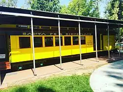 The barn received its largest expansion in 2010, when the Carolwood Foundation acquired the original Disneyland Railroad combine car from the family of railroad collector Bill Norred.[7] The car was part of the Retlaw I passenger train that was utilized on the Disneyland Railroad by Engine No. 2 E.P. Ripley from 1955 to 1966.[2] After a meticulous restoration, the combine car was placed in a pavilion next to the barn for display and preservation. The pavilion was built in such a way so that the combine car can be removed for temporary display elsewhere, such as at the Fullerton Railroad Days event and the D23 Expo.[8] In 2019, an exhibit space opened up inside the combine pavilion. Funds are still being raised for a more permanent pavilion.[7]