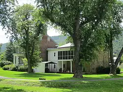 In 1861, a stone addition to the original 1774 Georgian structure was built. The large stone blocks used for the construction of the addition were quarried from the plantation's Mill Creek Mountain, a ridge located across the South Branch Potomac River to the west of the mansion. The stone blocks were hewed by sawyers, then transported across the river to the mansion, and lifted upon the addition's scaffolding with wheelbarrows. A Mr. Ferrybe supervised and managed the stone addition's construction.[35]