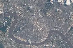In many cases, the angles of the streets correspond with the angles formed by borders of the wards. Taken from the International Space Station on June 28, 2022.