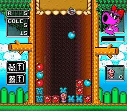 Screenshot of the single-player mode in the SNES version. The player character Toad rearranges the objects in the playing field such that monsters and bombs of matching colors are placed adjacently in rows.
