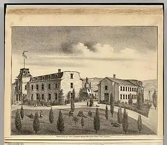 Washington College was founded in 1871 on a small hummock donated by E.L. Beard, located across from the C.P.R.R. Washington Corners depot, by the people of Washington Township as a scientific and industrial school. The founders were local landowners, educators and farmers, including W.F. Lynch, Albert Lyser, William Horner, Origin Mowry, H. Curtner, S.I. Marston, H. Crowell, and M.W. Dixon. The first building cost $30,000.[1] It opened in July 1872 with the Reverend Silas Sykes Harmon and his wife as teachers. Two of their daughters later taught there; Rev. Harmon later started a school in Berkeley.[2][3][4] It was coeducational and nonsectarian; according to its catalog, "The idea is that young women should enjoy equal intellectual advantages with young men, and that they should be educated together." Courses were given in bookkeeping, calligraphy, commercial letter writing, Latin, Greek, and advanced English. By its third year of operation, it had an enrollment of 130 students from all over the state, only some of whom lived on campus in an impressive dorm, women on the first floor and men on the second, with a gymnasium for group exercise.[1][5] The Daily Alta California on August 13, 1875, reported another year of college overflow, necessitating the procurement of entire houses from the village to house the overflow students, and called for the construction of new campus buildings for housing.[6] Washington College continued as a nonsectarian coeducational academy for eleven years until 1883.[7]