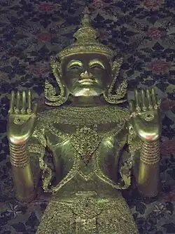 The principle Buddha image made of brass in the stance of subduing Mara. Another striking Buddha image is a high-relief crowned Buddha image made of teak covered by tin. The image depicts the stance of pacifying the ocean. The Fine Arts Department registered this image as national heritage. In addition, the walls and ceiling of the ubosot there are also very beautiful and refined Chinese mural paintings.[1][2]