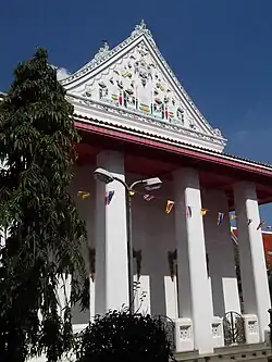 The overall architecture of the temple is Chinese style, without ornated decorative pieces. The vihara (sanctuary) structure was once made of brick and mortar and it was restored to a reinforced concrete during the time of the renovation of the ubosot (ordination hall). A number of ancient Buddha images are enshrined interior.[1] When the ubosot was in a state of disrepair. The abbot Phra Wisutthiwaraphon had it renovated in 1974 and the renovation was completed in 1977. It structure was changed to reinforced concrete like the vihara.[1]