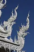 The principal building, the ubosot, is an all-white building with fragments of mirrored glass embedded in its exterior. It embodies design elements from classic Thai architecture, such as the three-tiered roof and abundant use of Nāga serpents.[5] "Inside the temple, the decor swiftly moves from pristine white to fiery and bewildering. Murals depict swirling orange flames and demon faces, interspersed with Western idols such as Michael Jackson, Neo from The Matrix, Freddy Krueger, and a T-800 series Terminator. Images of nuclear warfare, terrorist attacks such as the World Trade Center attack, and oil pumps hammer home the destructive impact that humans have had on earth. The presence of Harry Potter, Superman, and Hello Kitty confuses the message somewhat, but the overall moral is clear: people are wicked.[8]