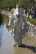 After crossing the bridge, the visitor arrives at the "gate of heaven", guarded by two creatures representing Death and Rahu, who decides the fate of the dead. In front of the ubosot are several meditative Buddha images.[5]