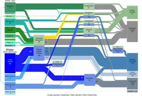 Among the first studies to evaluate the water and energy relationship was a life-cycle analysis conducted by Peter Gleick in 1994 that highlighted the interdependence and initiated the joint study of water and energy.[3] In 2014 the US Department of Energy (DOE) released their report on the water-energy nexus citing the need for joint water-energy policies and better understanding of the nexus and its susceptibility to climate change as a matter of national security.[4] The hybrid Sankey diagram in the DOE's 2014 water-energy nexus report summarizes water and energy flows in the US by sector, demonstrating interdependence as well as singling out thermoelectric power as the single largest user of water, used mainly for cooling.
