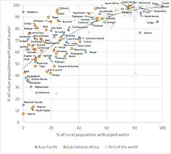 Urban and rural piped water coverage in Africa and Asia in 2015: Access to piped water in rural areas of Africa is consistently lower than in urban areas of Africa.[33]