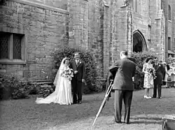 A newlywed couple standing in front of a church and their wedding photographer, Westmount, Montreal, 1945