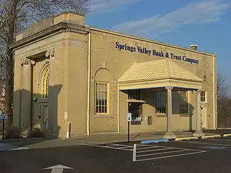 West Baden National Bank, also known as Springs Valley Bank & Trust Company, is a historic bank building located at West Baden Springs, Orange County, Indiana. It was built in 1917, and is a two-story, Classical Revival style reinforced concrete building sheathed in yellow brick with limestone detailing. It features a recessed entry with unfluted Ionic order columns in antis, large round-arched transom window, and a central parapet.[2]: 5