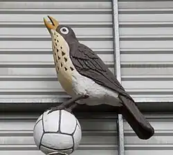 Albion's main club badge dates back to the late 1880s, when club secretary Tom Smith suggested that a throstle (song thrush) sitting on a crossbar be adopted for the badge.[67][B] The badge has been subject to various revisions since then.[68] It has always featured a throstle, usually on a blue and white striped shield, although the crossbar was replaced with a hawthorn branch at some point after the club's move to the Hawthorns. The throstle was chosen because the public house in which the team used to change kept a pet thrush in a cage. It also gave rise to Albion's early nickname, the Throstles. The hawthorn bush is also a favourite bush of throstles, which were regularly seen on the pre-stadium estate and local area. As late as the 1930s, a caged throstle was placed beside the touchline during matches and it was said that it only used to sing if Albion were winning.[67] In 1979, an effigy of a throstle was erected above the half-time scoreboard of the Woodman corner at the Hawthorns,[69] and was returned to the same area of the ground following redevelopment in the early 2000s.[70]