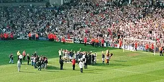 Albion's "club anthem" is The Lord's my Shepherd, a setting of Psalm 23. The song originated following a rare Sunday game in the 1970s and has been sung at matches ever since.[106] Supporters of the team celebrate goals by bouncing up and down and chanting "Boing Boing". This dates back to the 1992–93 season, when the team was promoted from the new Second Division, with the origin of the chant still unclear.[107] The Liquidator instrumental by the Harry J. Allstars has also been popularly played in the stadium and sung to since the late 1960s.[108] The reggae song "West Bromwich Albion" by Ray King is another club anthem popularly played before matches.[109] In recent years fans of the team have celebrated the end of each season by adopting a fancy dress theme for the final away match, including dressing as Vikings in 2004 in honour of Player of the Season Thomas Gaardsøe.[110]