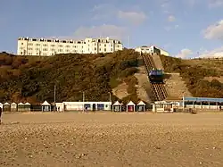 ![]() The beach, cliff railway and cliff-top hotels viewed from the Pier | |