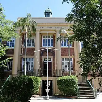 The Depression-era brick school building at West End State School (now called the Main Admin Building) was completed in 1936 and occupied on 30 June of that year by the amalgamated West End Girls and Boys Schools.[58][59][60][61] The building was officially opened on 28 November 1936 by the Minister for Public Instruction, Frank Cooper.[62] The Telegraph newspaper reported the Depression-era brick school building had cost £20,410.[63][1]