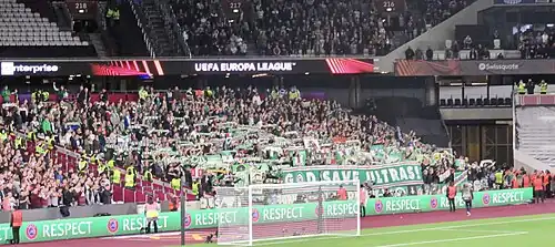 Their opening home game of the campaign came on 30 September to Rapid Wien. West Ham won the game 2–0 with goals from Declan Rice and Saïd Benrahma. Crowd violence marred the game, particularly after Rice's goal in the 29th minute, when Rapid Vienna fans jumped the barriers around the away supporters and objects were thrown between both sets of supporters.[107] The following month, West Ham were fined €60,000 by UEFA for the crowd trouble.[108]