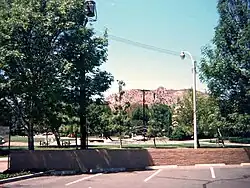 Mae Boyar Recreation Center and Castle Peak as seen from Highlander Road School, 1978