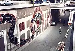 The Collective's core commissions included a relief mural for Bell Street Passage in Birmingham, installed in 1987 and now lost, which was a pivotal example of how artists responded to evolving public art policy by producing inclusive, public‑oriented, and regeneration‑aligned artworks within a broader context of post-industrial urban regeneration and related cultural policy in the UK during that period.[1]