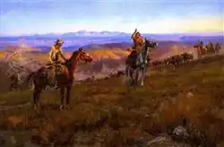 Charles Marion Russell, also known as "Kid Russell", was an American artist of the American Old West, who used to be a cowboy in ranch. His cowboy background gave him advantages in his art career that he was familiar with the cowboy life and qualified to record the western history in which he played a part.[22] Russell was unschooled and self-taught but he was recognised as distinguished personality in the area of Western Art.[23] He created more than 2000 paintings of cowboys, Indians and landscapes of the West. During his cowboy career, he was actually not treated as a qualified cowboy but a storyteller and artist who expressed himself through the art and literary poesy. Even after Russell achieved recognition and acclaim, he remained the old traditions of the Old West and was devoted to the West before the white civilisation was imposed upon it.[24]