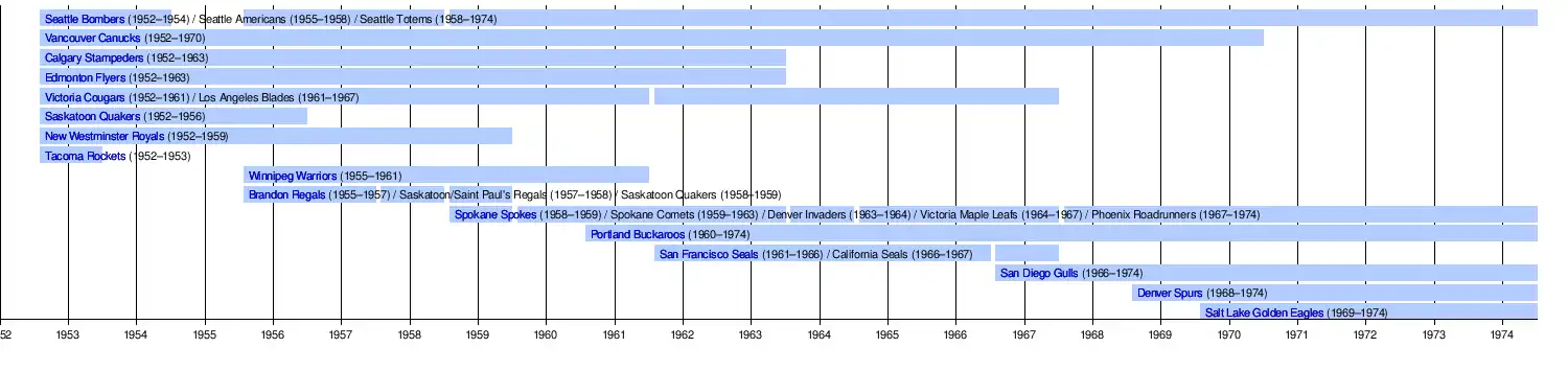 Salt Lake Golden EaglesDenver SpursSan Diego Gulls (1966-1974)San Francisco Seals (hockey)Portland BuckaroosSpokane SpokesBrandon RegalsWinnipeg Warriors (minor pro)Tacoma Rockets (PCHL and WHL)New Westminster RoyalsSaskatoon QuakersVictoria Cougars (1949–1961)Edmonton FlyersCalgary Stampeders (hockey)Vancouver Canucks (WHL)Seattle Bombers
