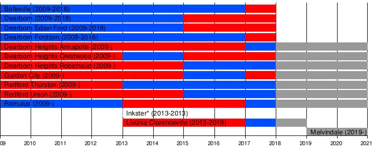 | Dearborn Edsel Ford | Thunderbirds | Dearborn | 2009 | Michigan Mega Conference | 2018 | Downriver League |