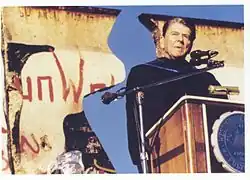 Breakthrough is a sculpture consisting of eight sections of the Berlin Wall. It commemorates the collapse of the Iron Curtain and the end of the Cold War. The sculpture is the work of artist Edwina Sandys, granddaughter of Winston Churchill.[21] It was dedicated to Westminster College in 1990 by former President Ronald Reagan.