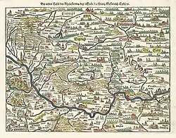 The oldest map is apparently the one that Martin Waldseemüller drew up at an unknown date but before 1508[6] in the workshop of the Gymnase de Saint-Dié-des-Vosges and published by Jean Schott in Strasbourg in 1513; the cartographer, in the service of the René II, Duke of Lorraine, represents in an indicative manner the respective provinces of Westrich (VASTI REGNI DOMINI) and the Duchy of Lorraine (LOTHARINGIE DUCATUS), thus named in their coats of arms located at the top of the map.