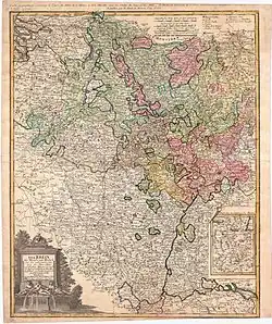 Westrich (sometimes Westerreich or Westerrych[1]), in Old French Wastriche[2] or Vestric[3] is the name of a former province of the Holy Roman Empire. The term is attested from the 13th century; the heart of this territory was located in the valley of the Saar, including its tributaries, the Blies, the Albe and the German Nied. Its boundaries, which fluctuated over time, were located to the east, along the northern Vosges and the Pfälzerwald, to the west along the Moselle between Sierck and Saarburg, to the south along the valley of the Seille[4] to the north, along the Nahe. In the Holy Roman Empire, Westrich constitutes a veritable mosaic of territories; The latter are shared between numerous lordships, including the duchies of Lorraine, Palatinate-Deux-Ponts, Duchy of Luxembourg, as well as the Prince-Bishopric of Metz, the archbishopric of Trier, the Elector palatine, the County of Nassau-Saarbrücken, County Palatine of Veldenz, La Petite-Pierre de Deux-Ponts-Bitche. The name "Westrich" slowly fell into disuse after the ravages caused to this province by the Thirty Years' War. Today it is a "phantom province"[5] which covers the current territories of Saarland, the North-East of the Moselle including Dieuze, the Alsace bossue, and the South-West of the Rhineland-Palatinate (Südwestpfalz).